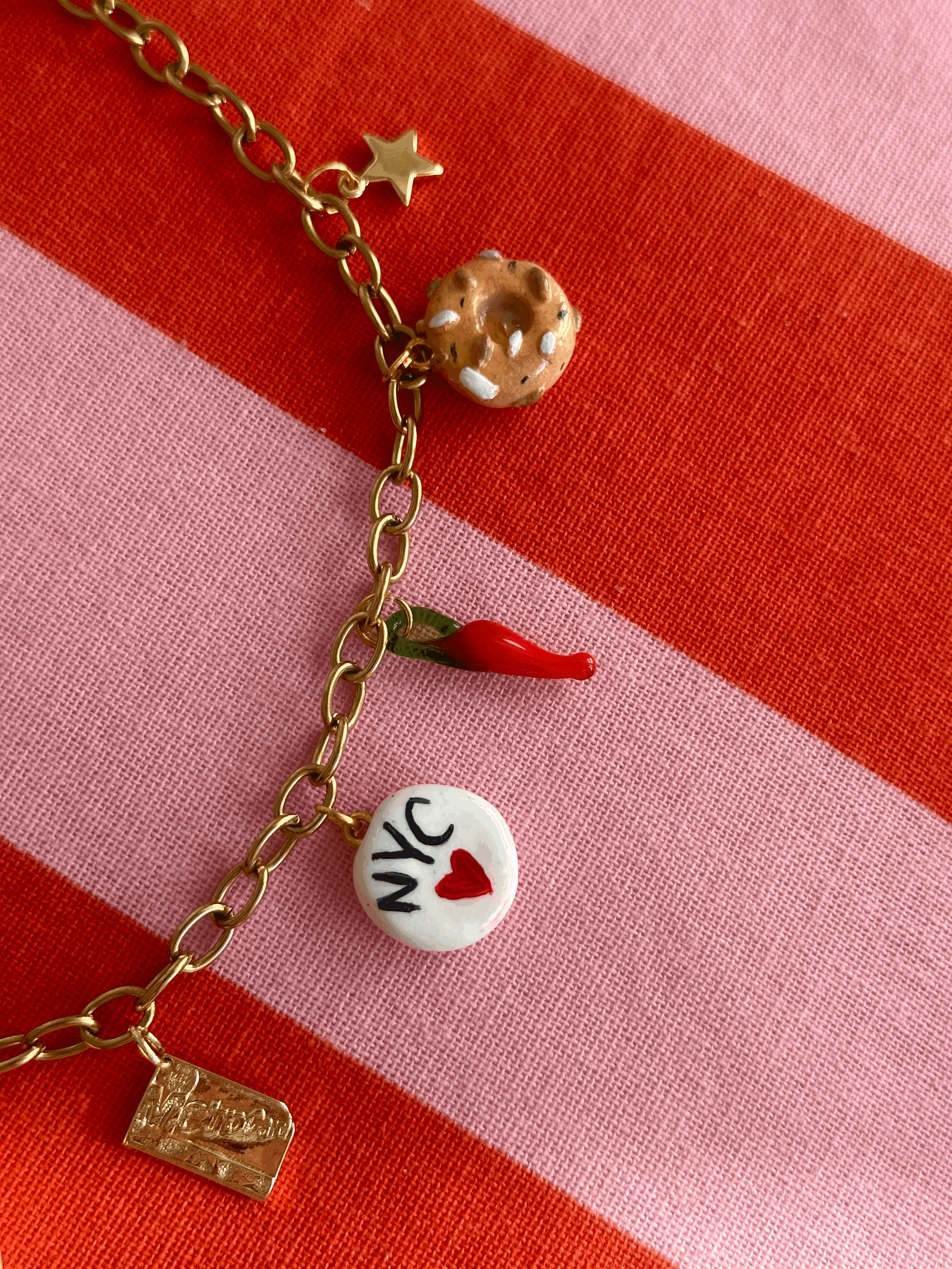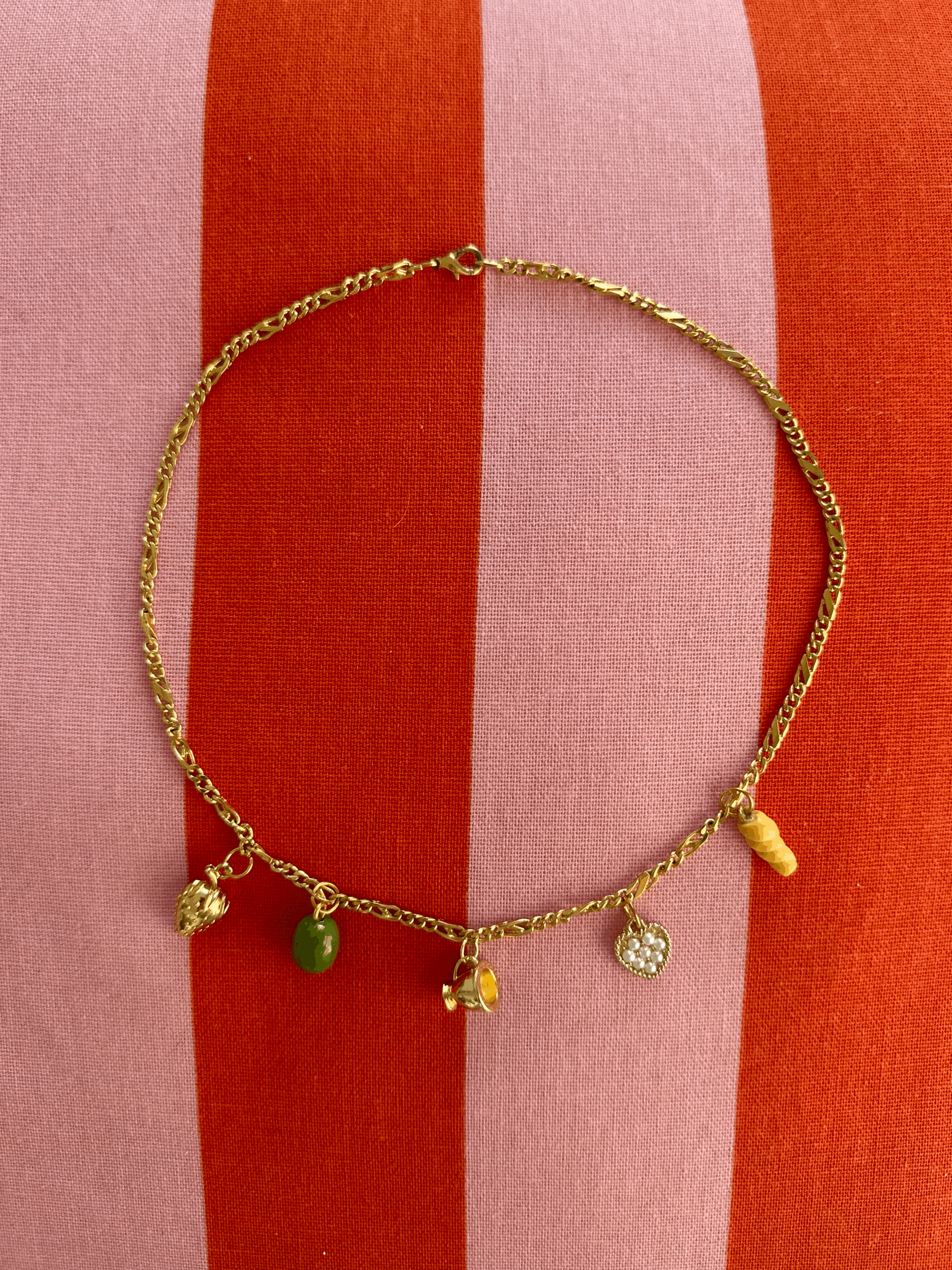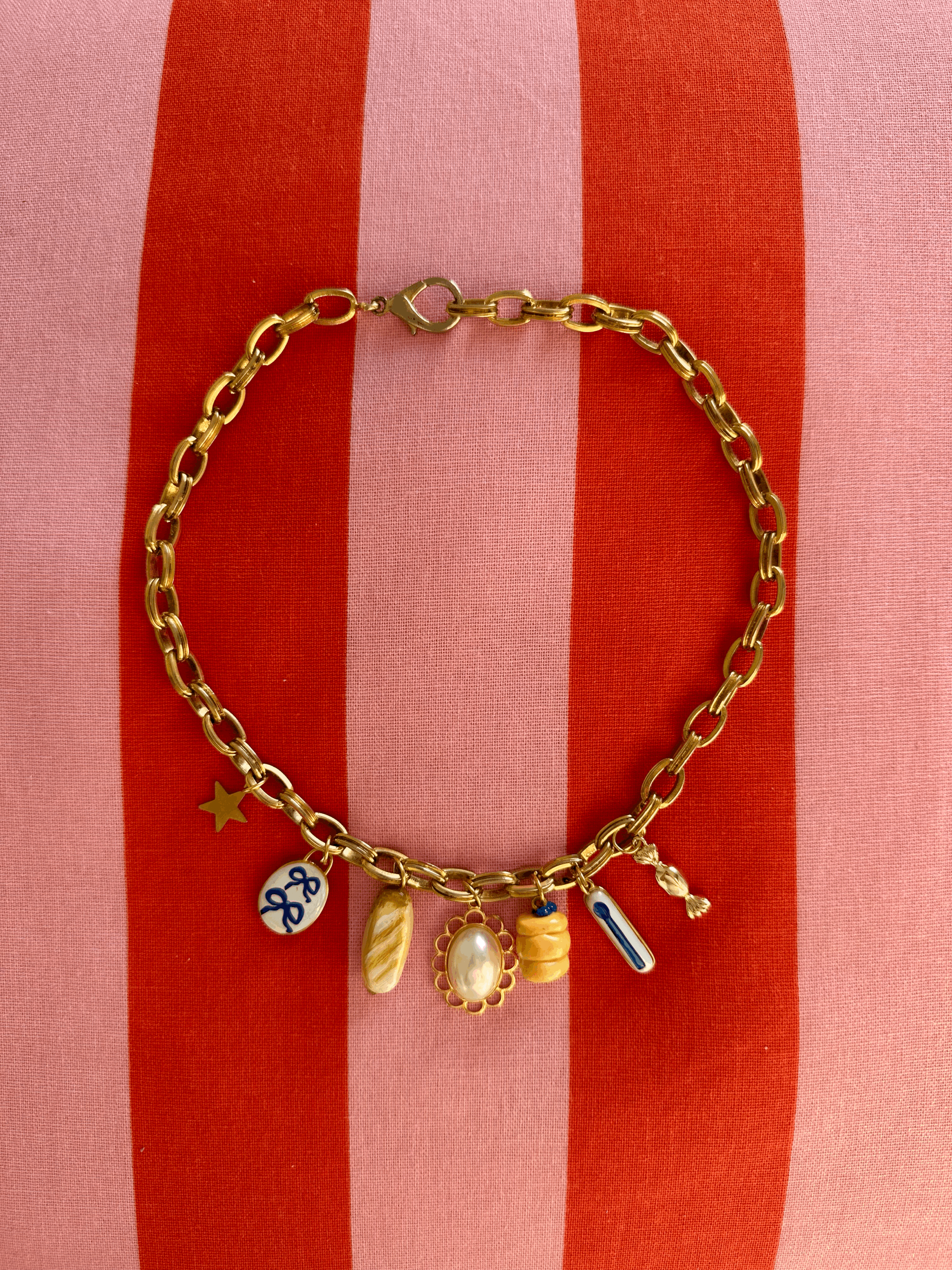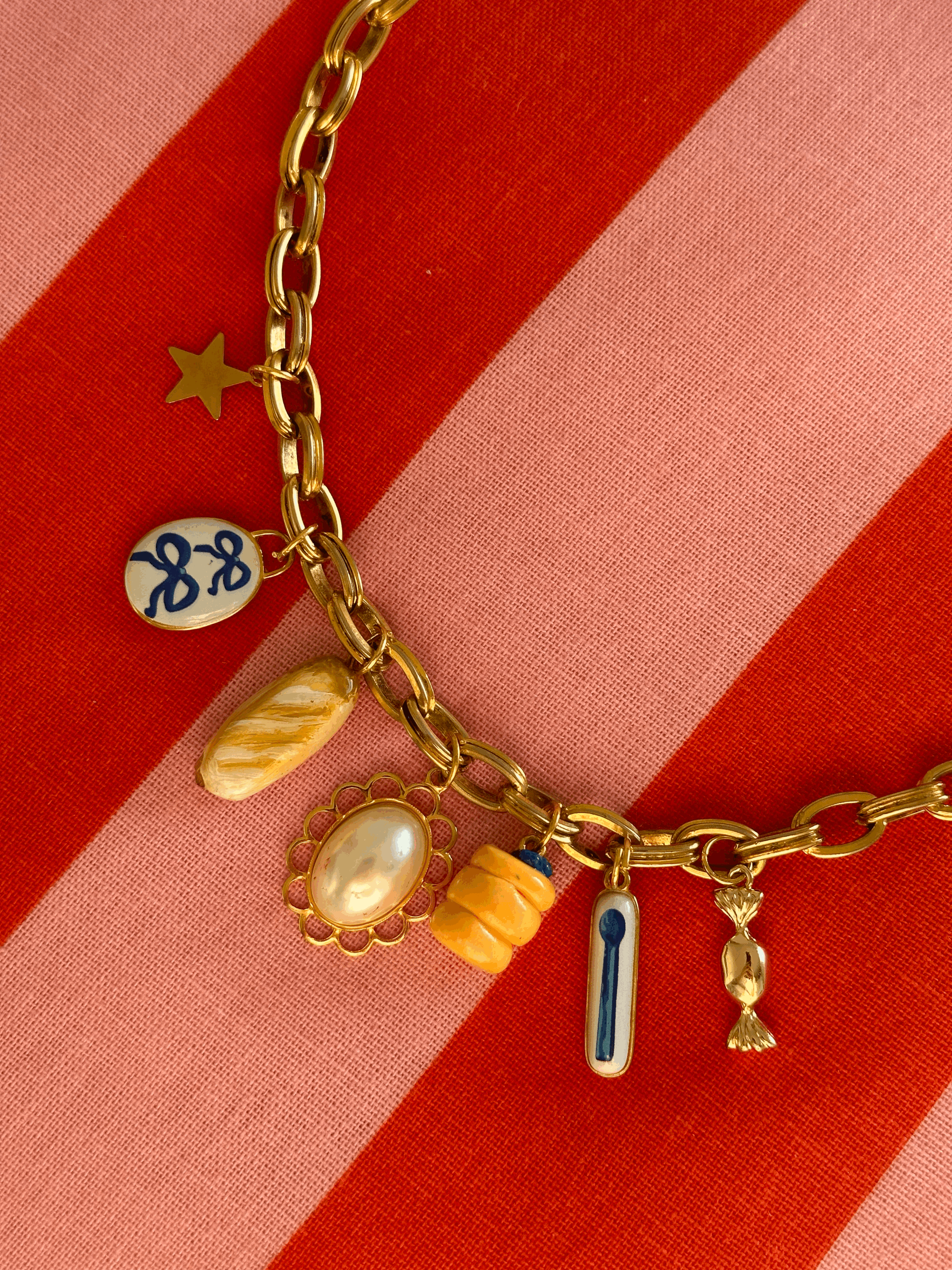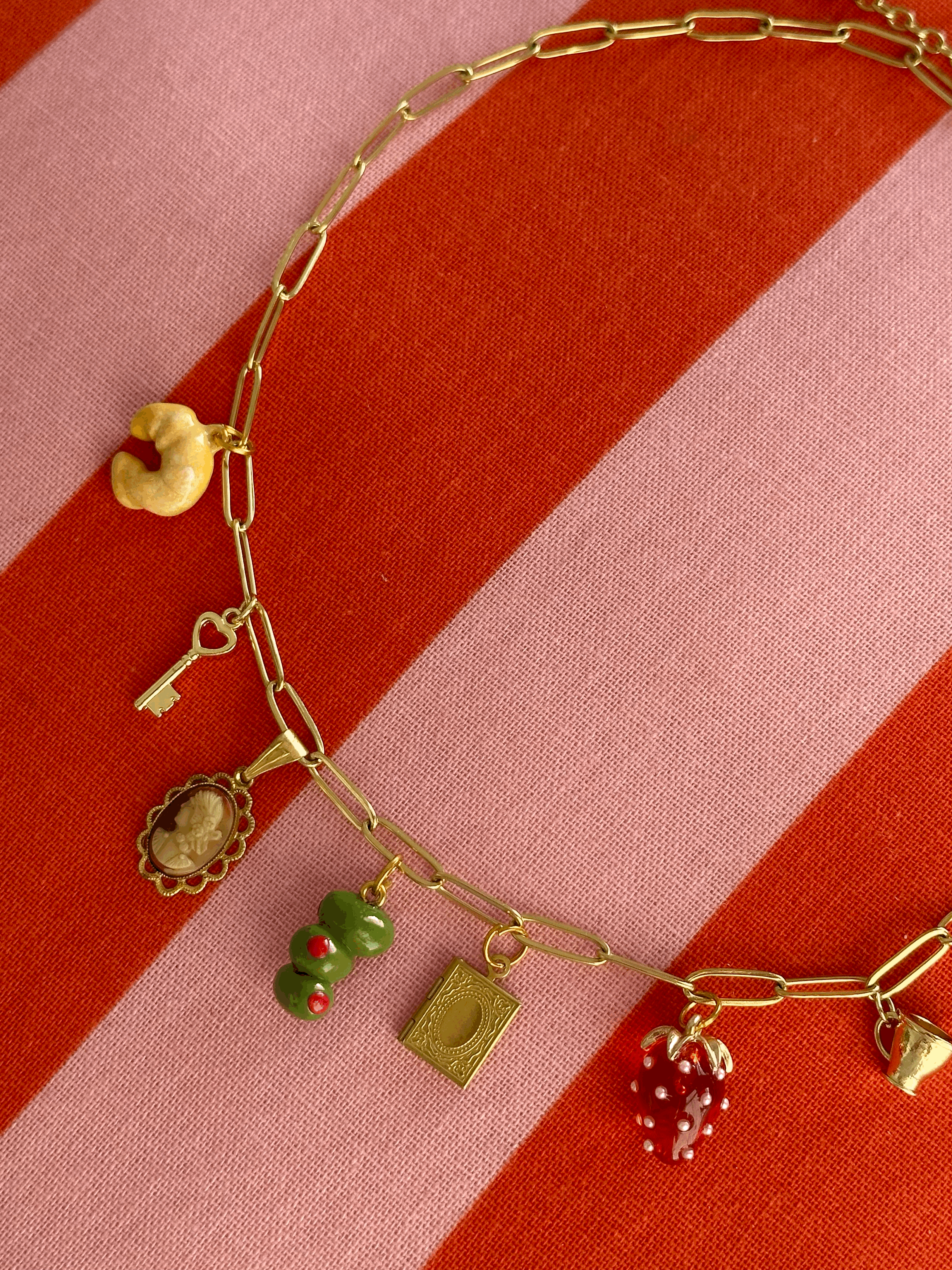 We have a selection of vintage sourced and 18K gold-filled charms, delicate glass and handcrafted, hand-painted clay charms. We recommend handling with care and avoiding prolonged exposure to water or direct sunlight.