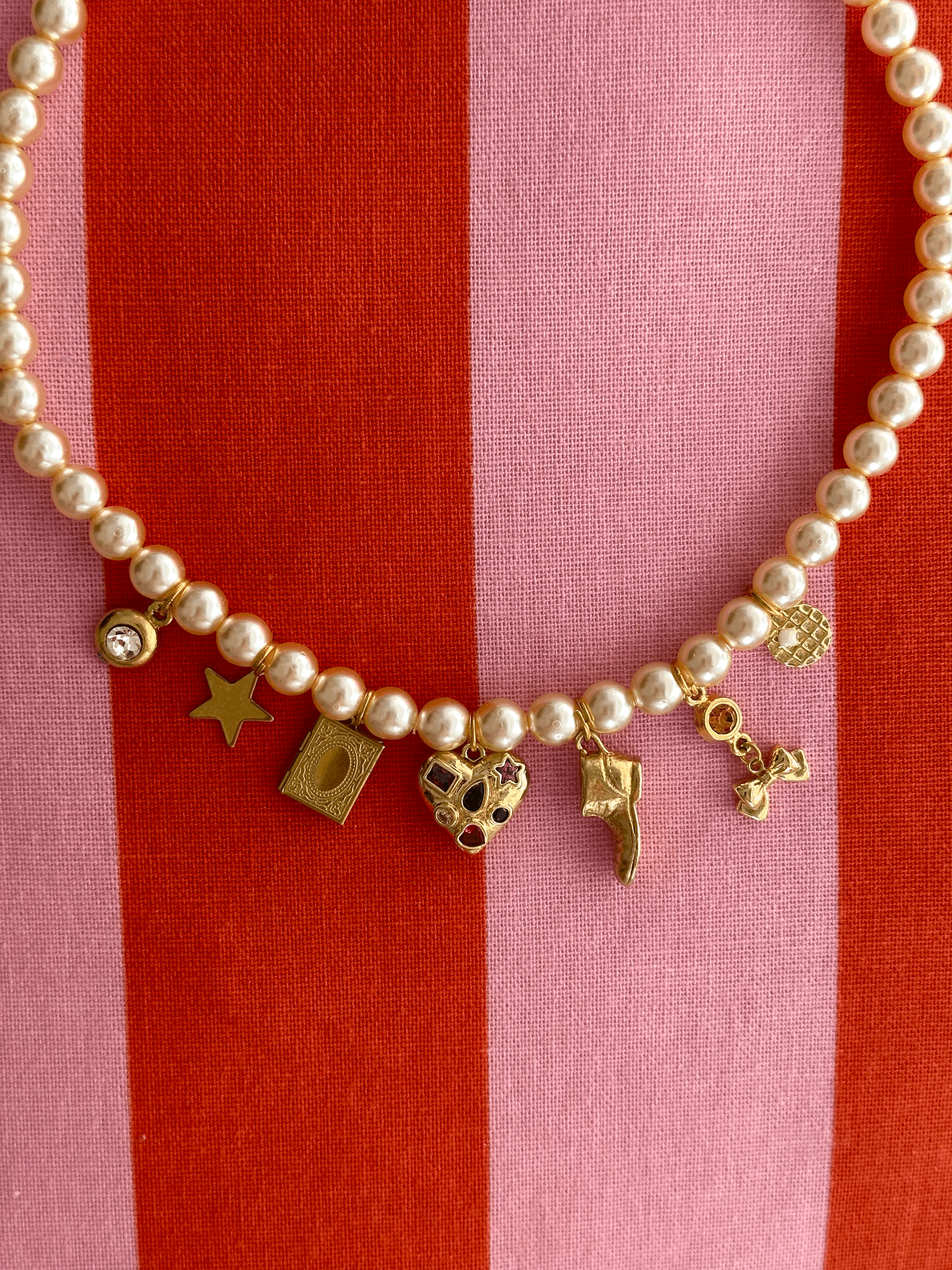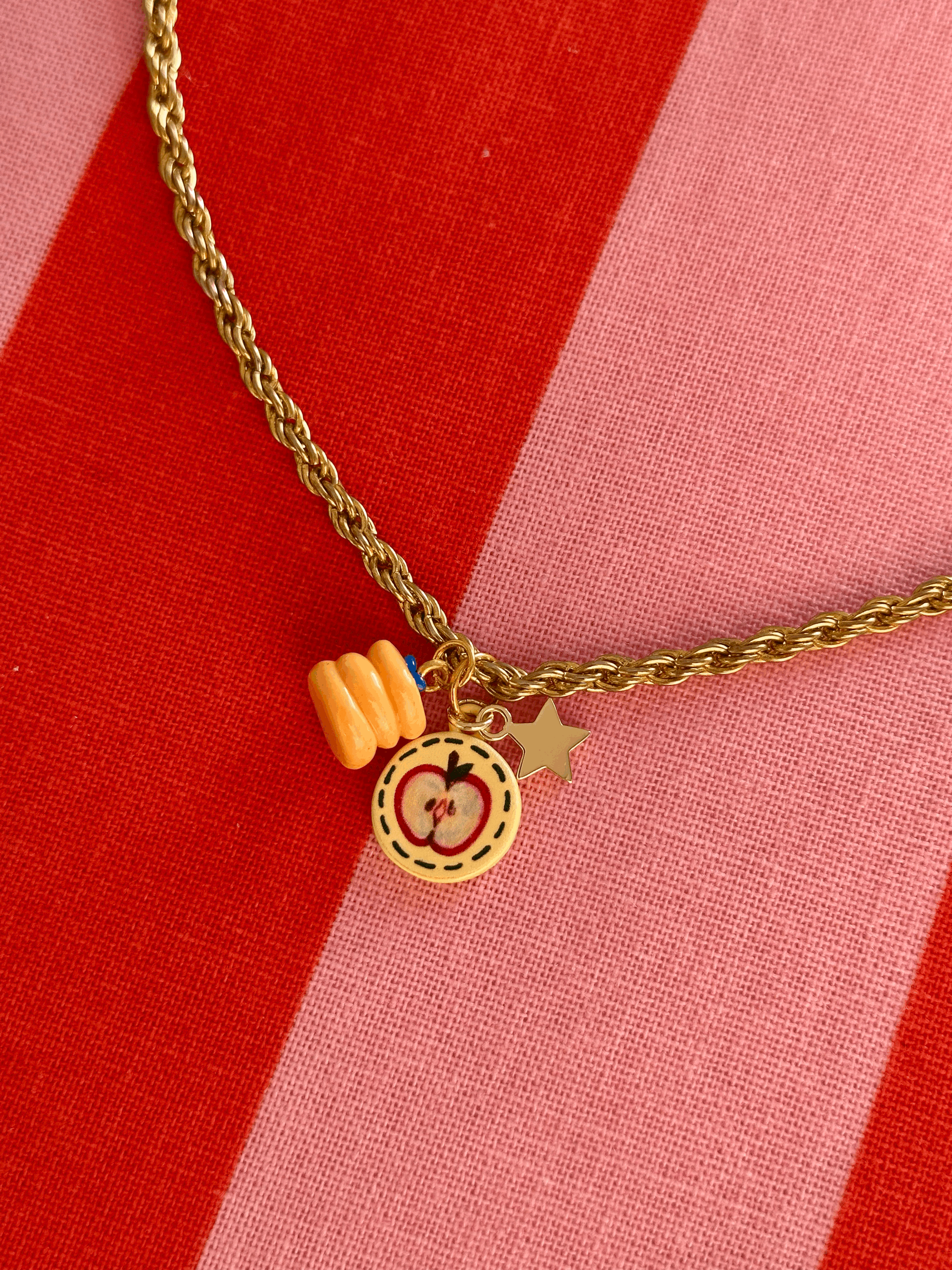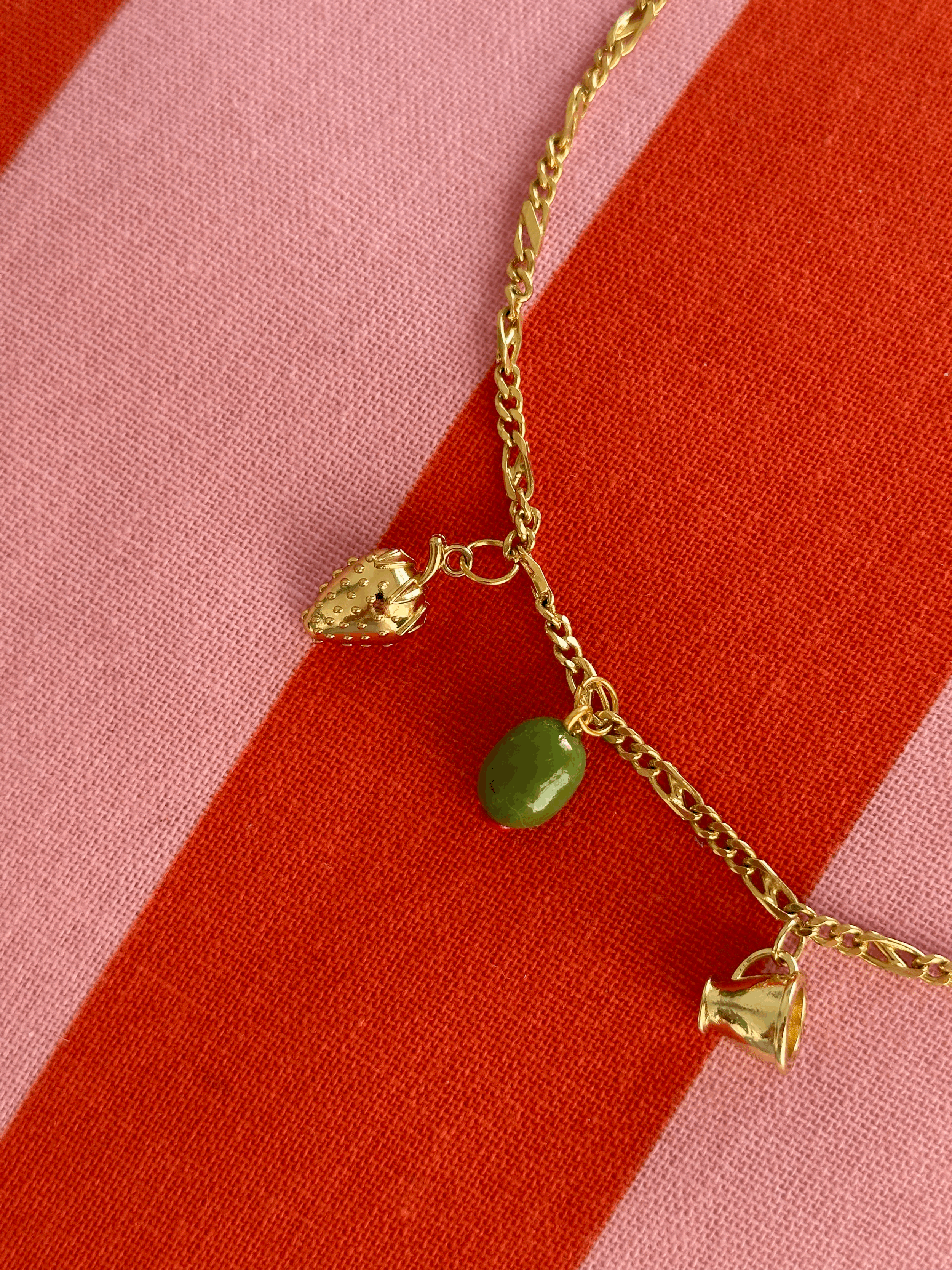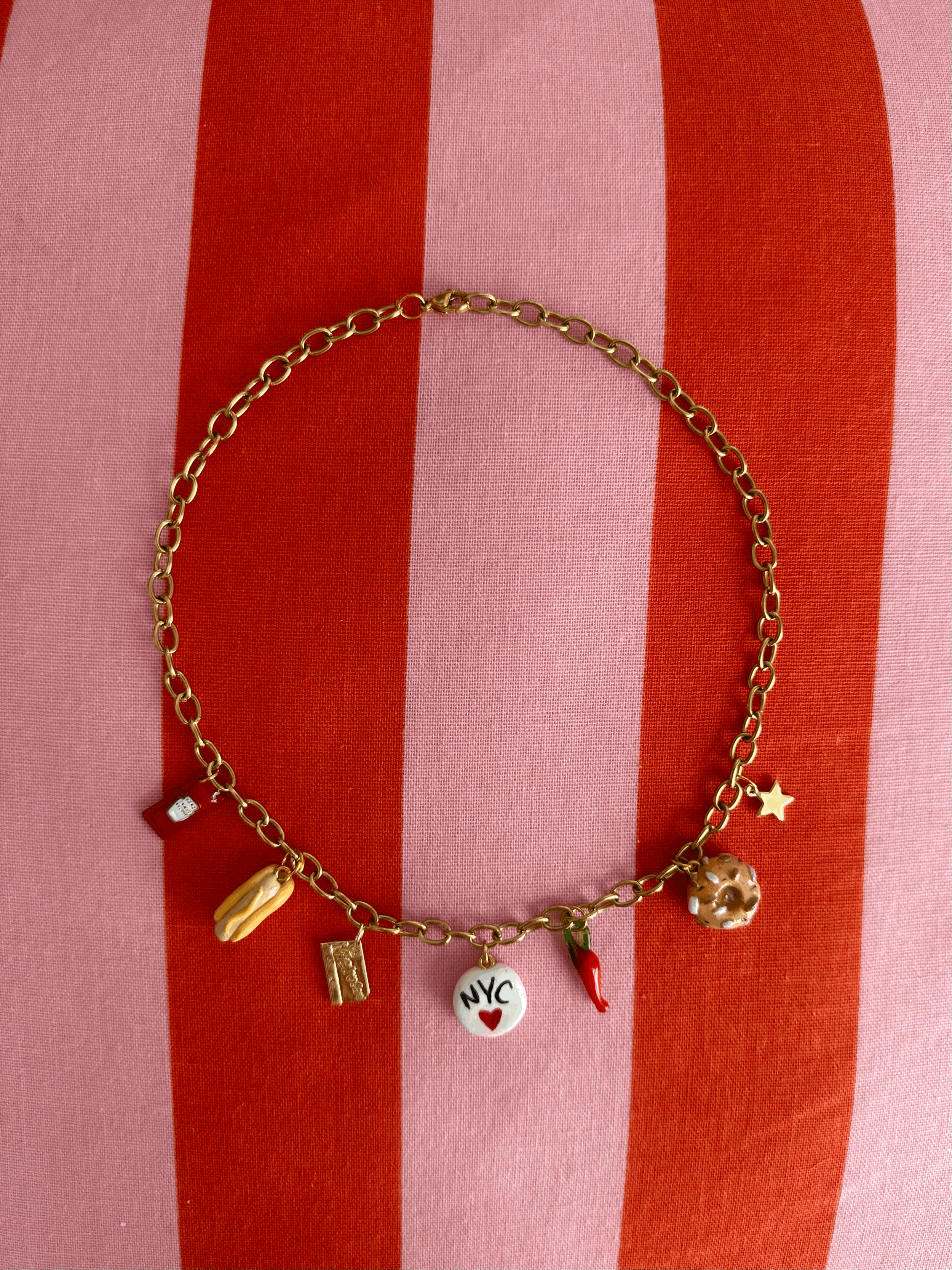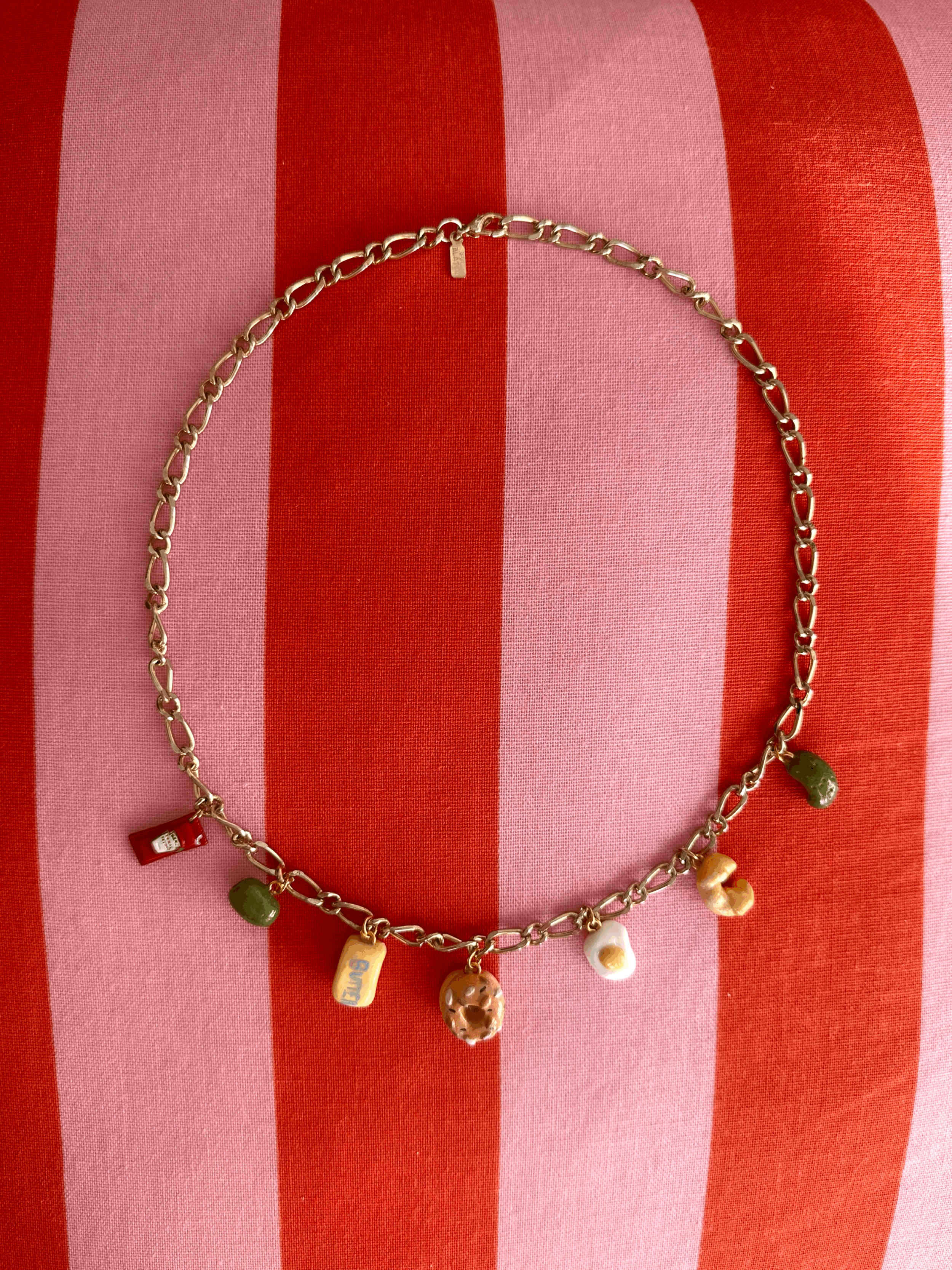 We have a selection of vintage sourced and 18K gold-filled charms, delicate glass and handcrafted, hand-painted clay charms. We recommend handling with care and avoiding prolonged exposure to water or direct sunlight.