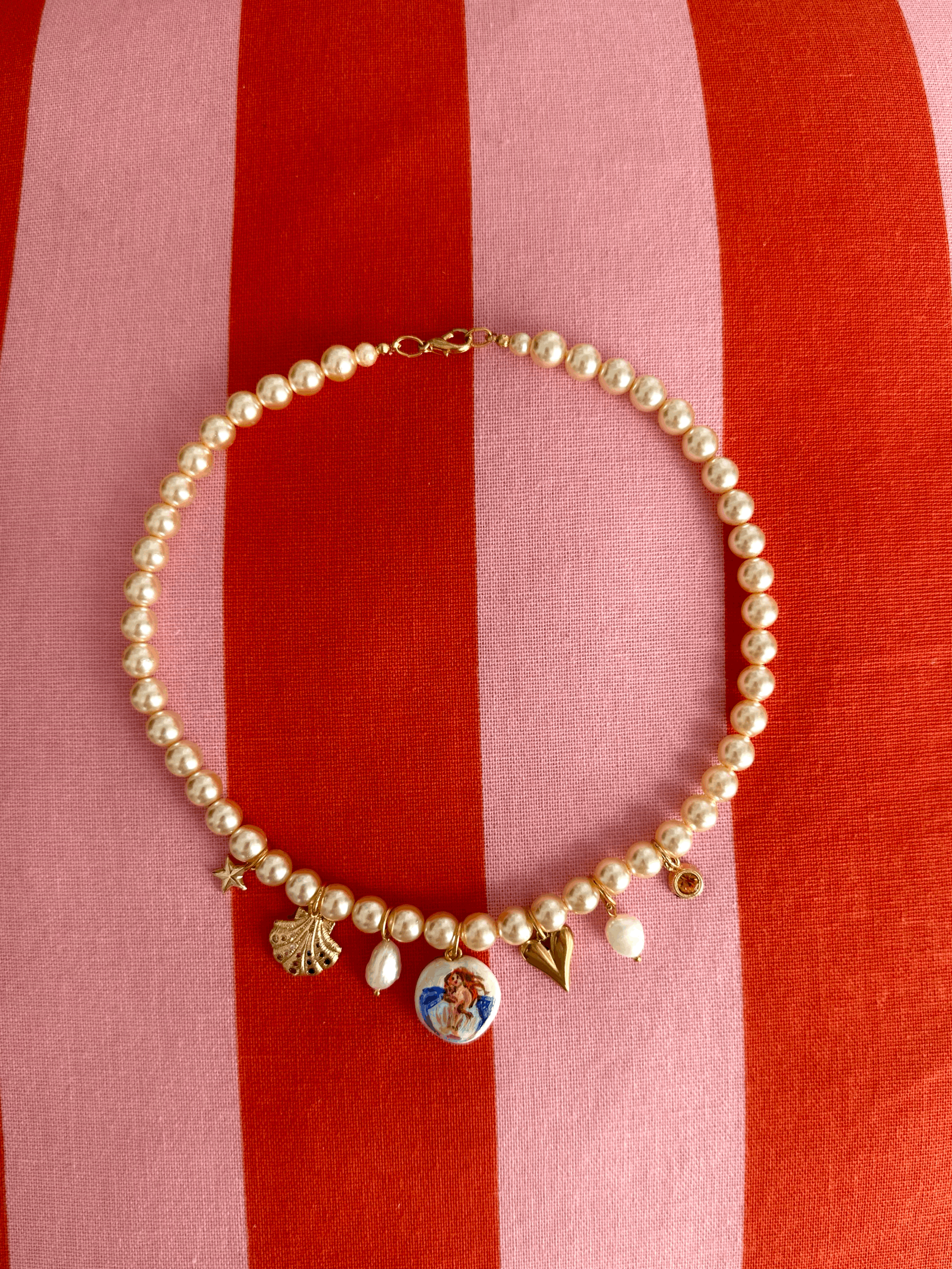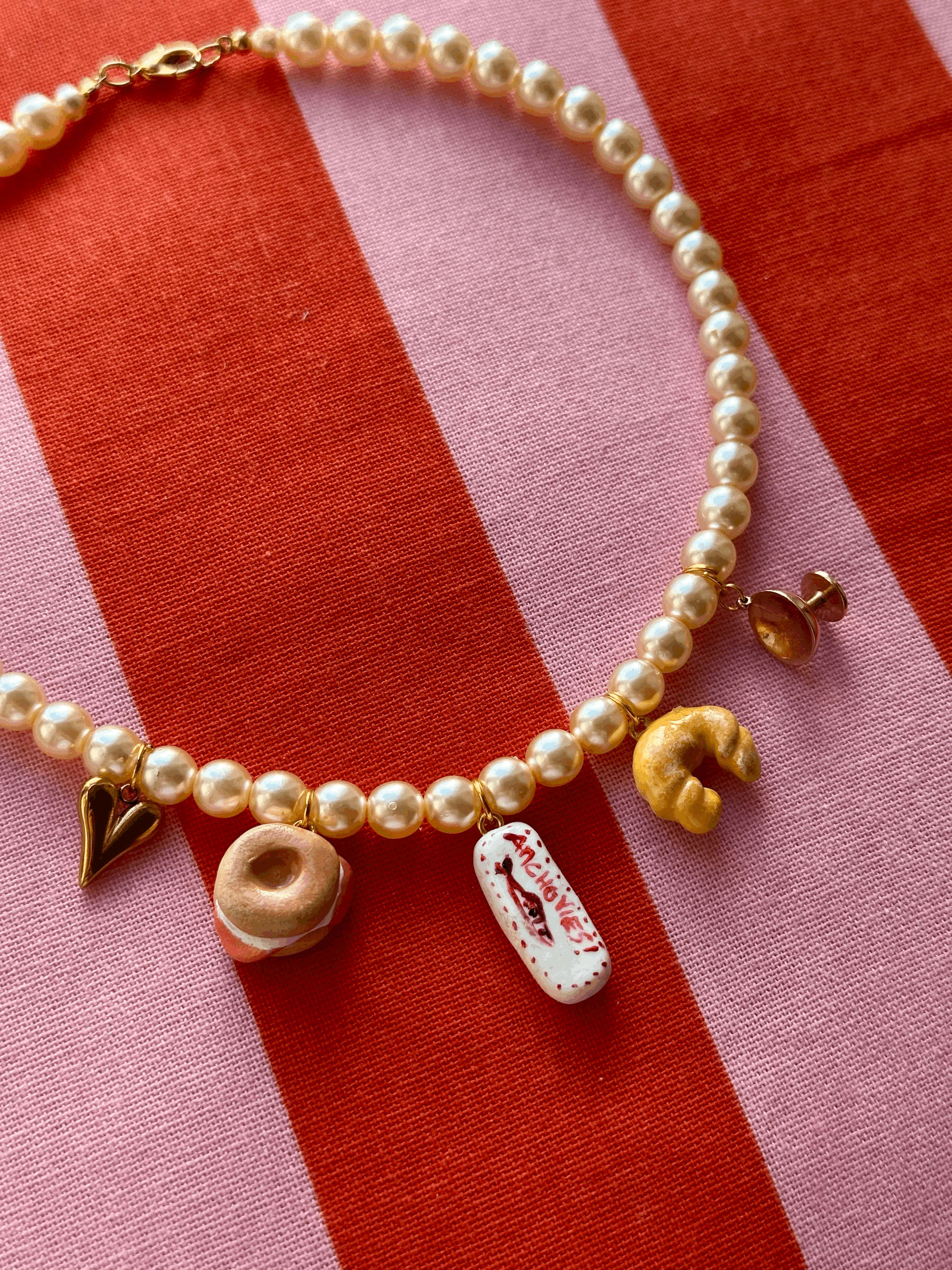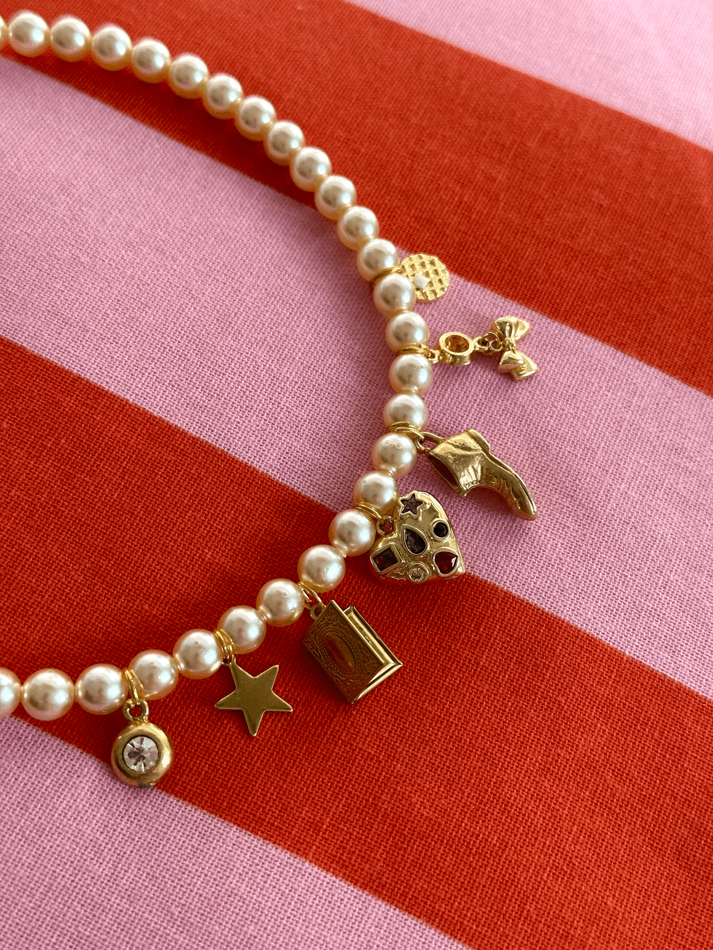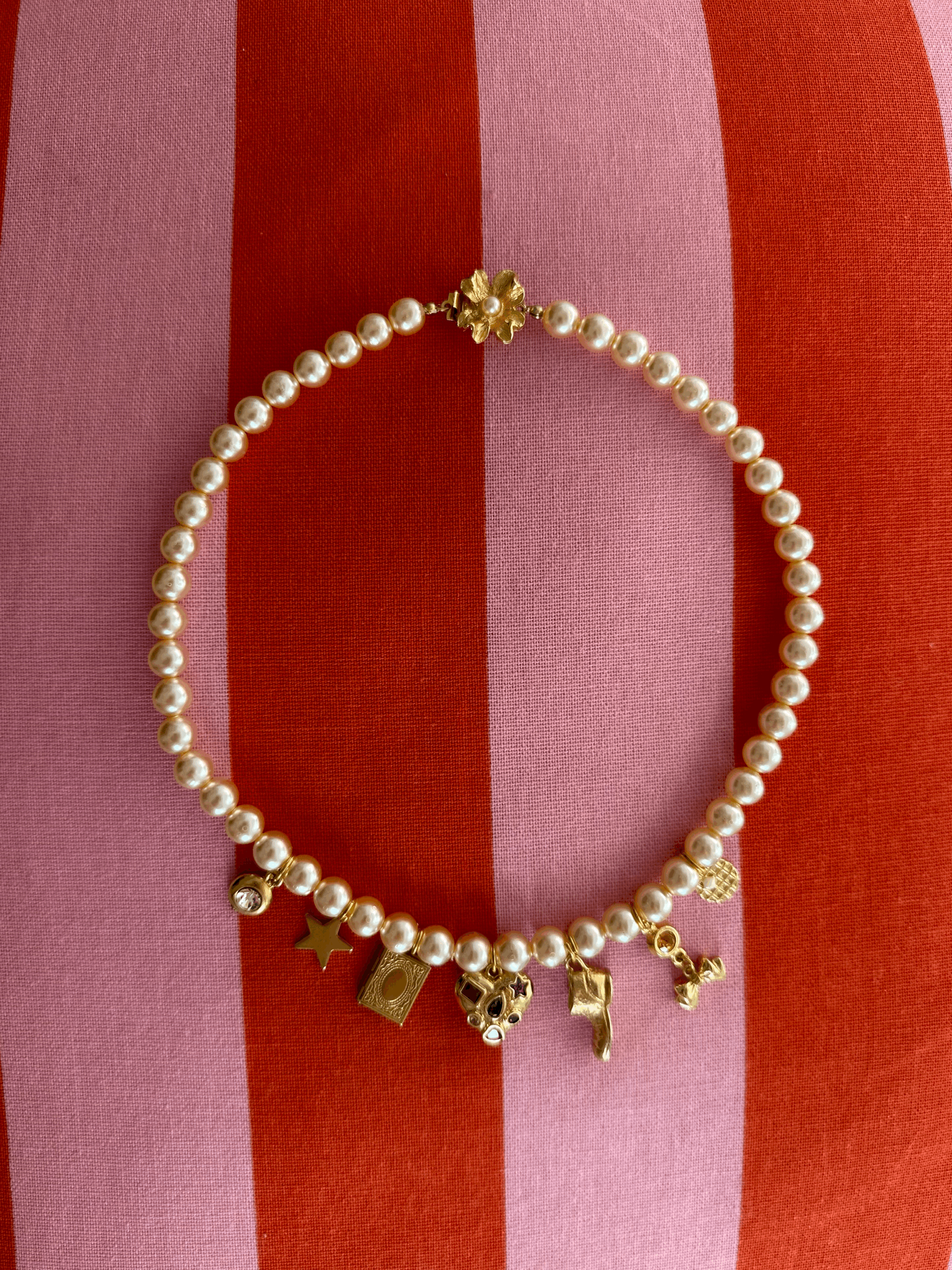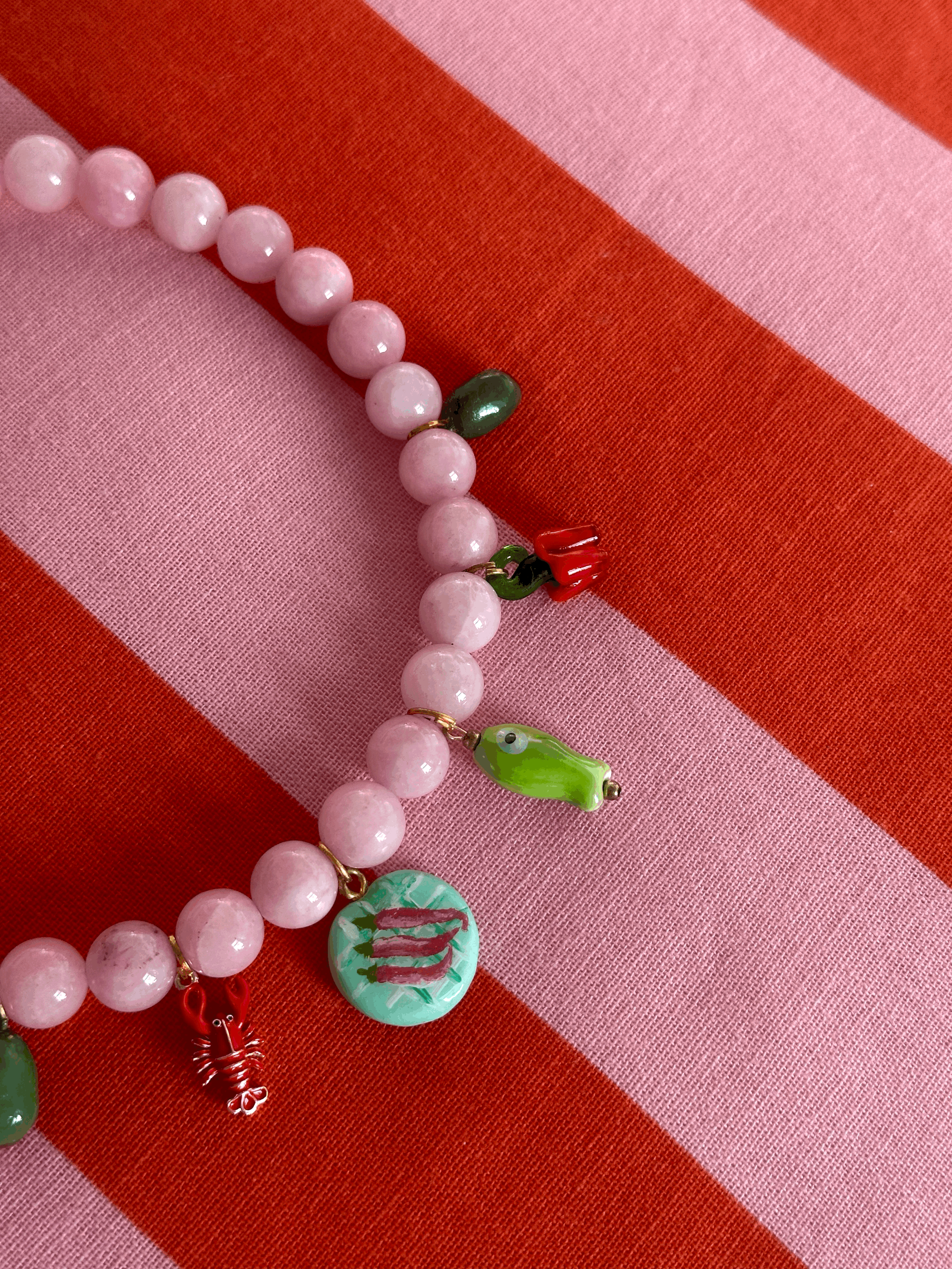 We have a selection of vintage sourced and 18K gold-filled charms, delicate glass and handcrafted, hand-painted clay charms. We recommend handling with care and avoiding prolonged exposure to water or direct sunlight.
