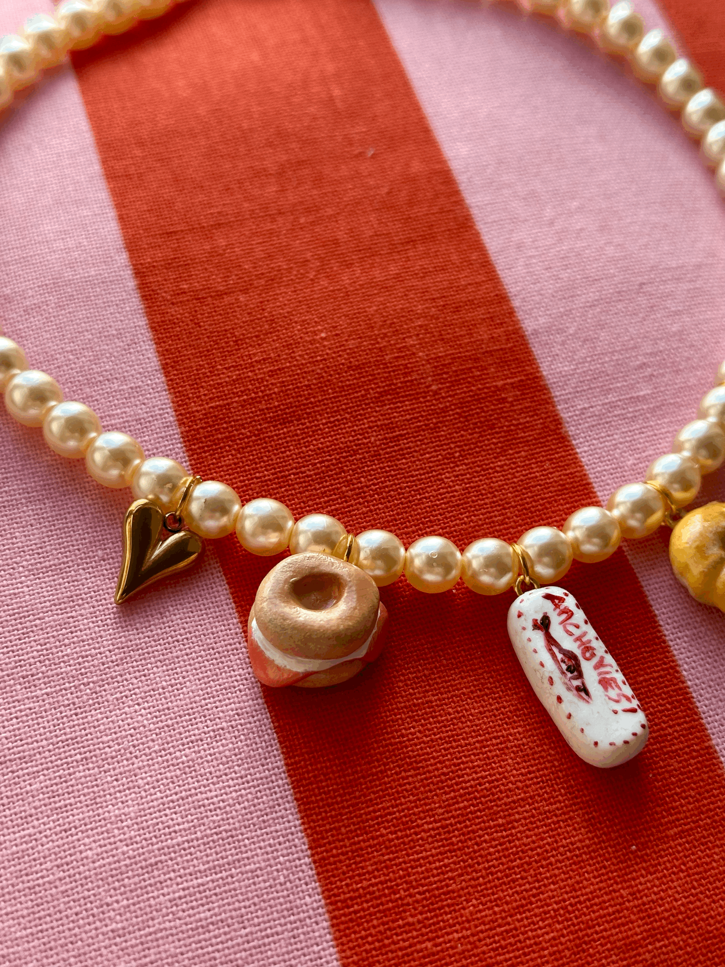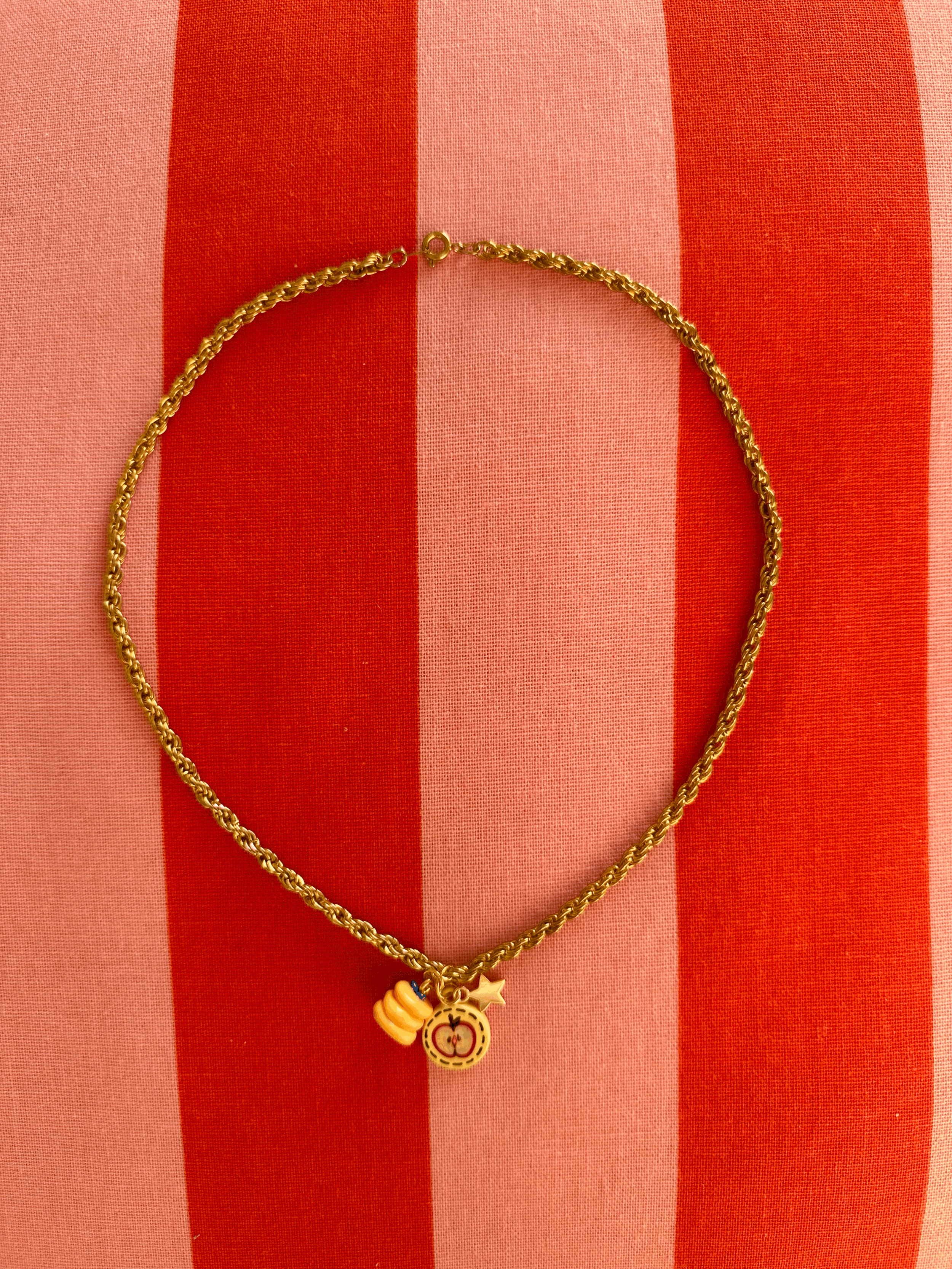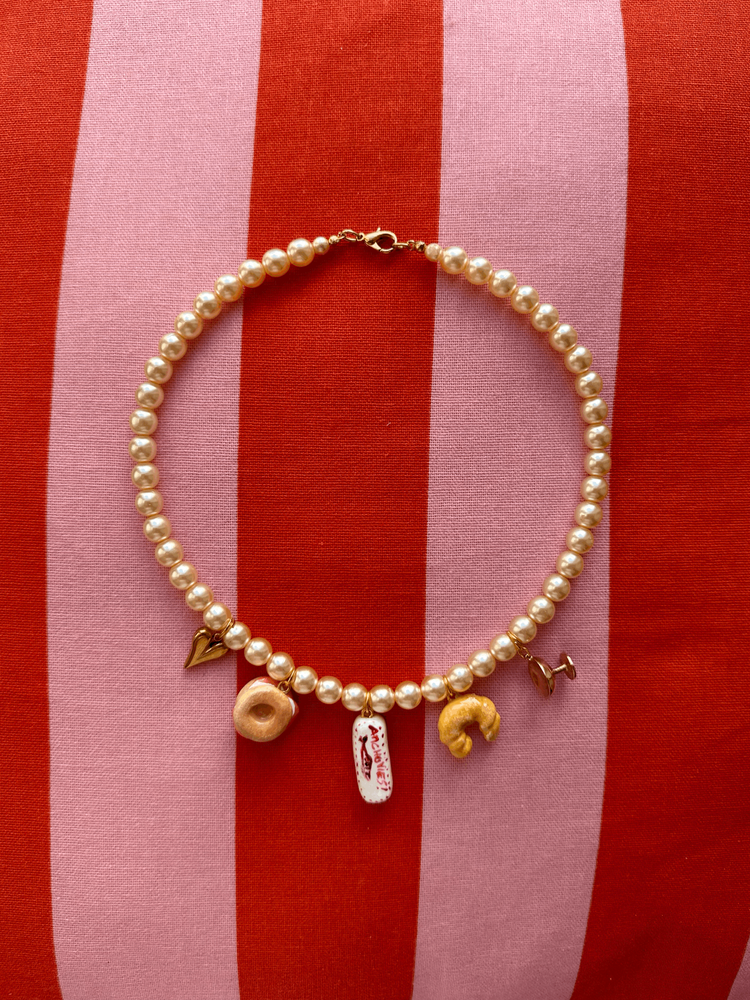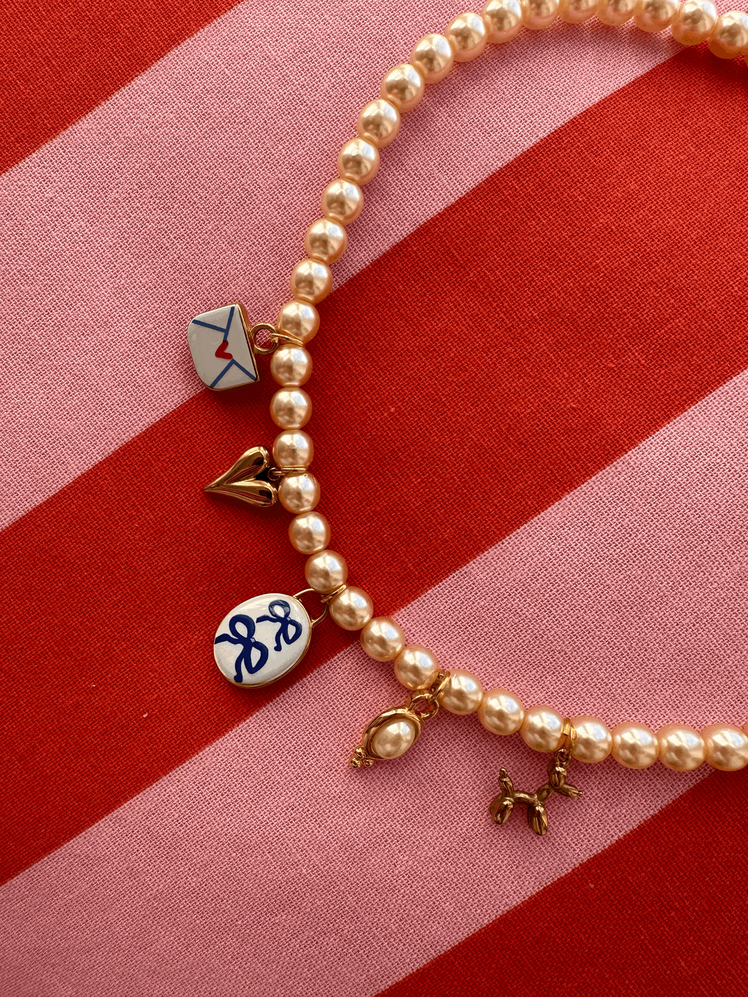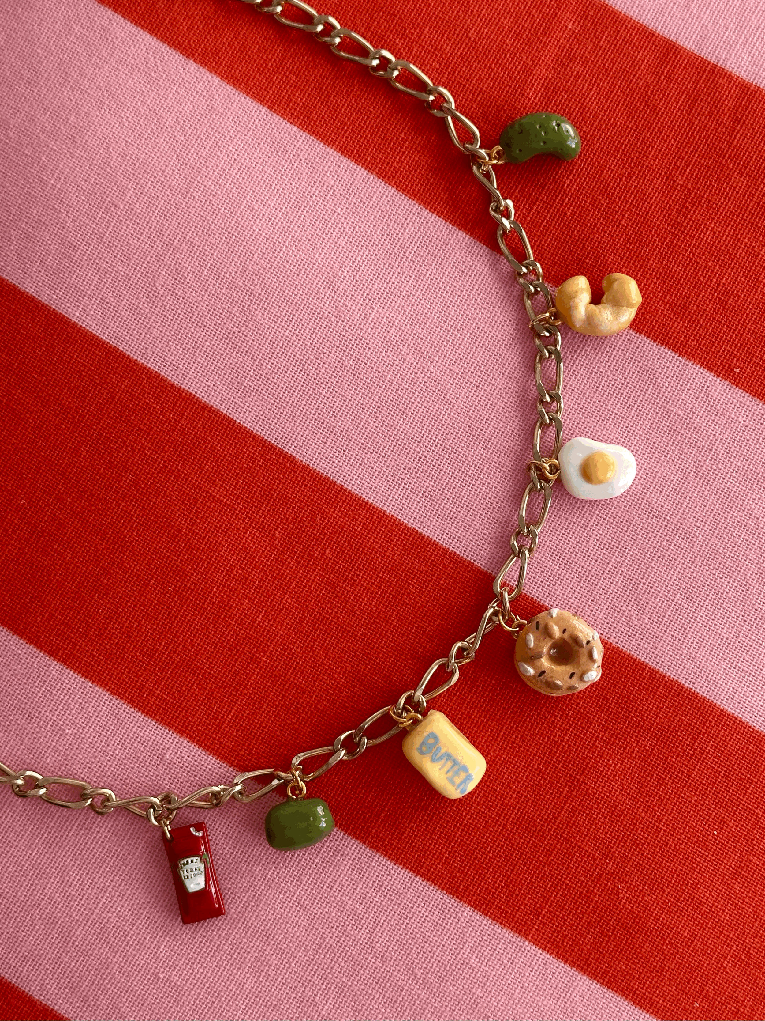 We have a selection of vintage sourced and 18K gold-filled charms, delicate glass and handcrafted, hand-painted clay charms. We recommend handling with care and avoiding prolonged exposure to water or direct sunlight.